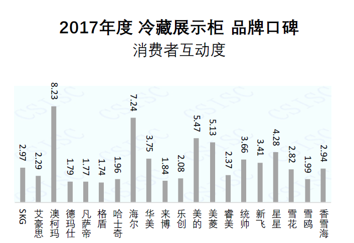 消费者互动度方面,澳柯玛遥遥领先。报告指出,和一般的消费者不同,冷藏展示柜的消费者多是商超卖家、餐饮服务者、糕点店主等。冷藏柜消费者与冷藏柜品牌互动也主要体现在售前售后服务方面。澳柯玛专业做冷柜,单看其销量连续近20年保持行业第一,便可以知道其冷藏柜消费者的群体有多大,品牌效应使得冷藏柜市场消费者互动最多的品牌是澳柯玛。
