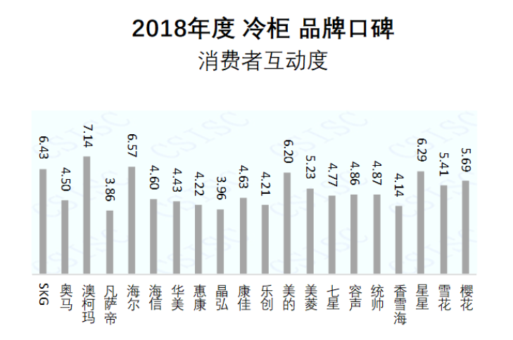 消费者互动度:澳柯玛、海尔、SKG在消费者互动度中位居前三。澳柯玛、海尔、SKG、美的、樱花、美菱、统帅、容声在近两期中表现稳定,消费者互动度位居前十。