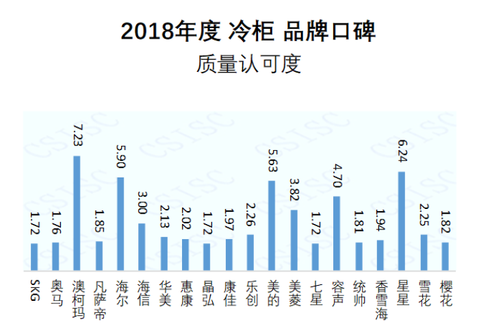 质量认可度:澳柯玛、星星、海尔在质量认可度中位居前三。澳柯玛、星星、海尔、美的、容声、美菱、海信、雪花在近两期中表现稳定,质量认可度位居前十。