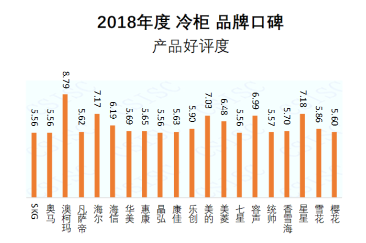 产品好评度:澳柯玛、星星、海尔在产品好评度中位居前三。澳柯玛、星星、海尔、美的、容声、美菱、海信、雪花、香雪海在近两期中表现稳定,产品好评度位居前十。