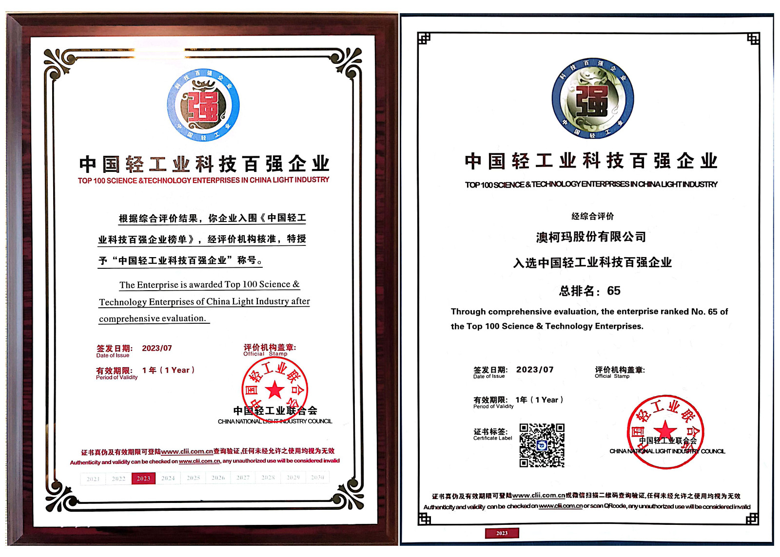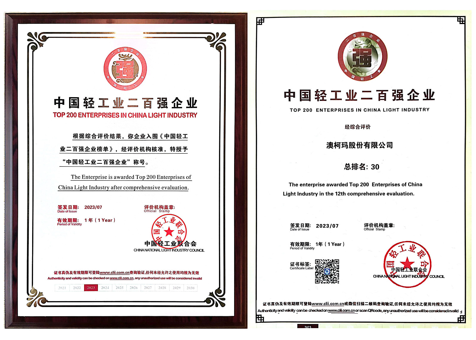 本次论坛发布了2022年度《中国轻工业二百强企业》、《中国轻工业科技百强企业》、《中国轻工业行业十强企业》等多项榜单,澳柯玛股份有限公司入选2022年度中国轻工业二百强(位次30)、中国轻工业科技百强企业(位次65)以及中国家用电器行业十强企业,这是自2011年该榜单开始发布以来,澳柯玛股份有限公司连续十二年入选,展现了公司在轻工业企业中强大的竞争力和科技创新能力。