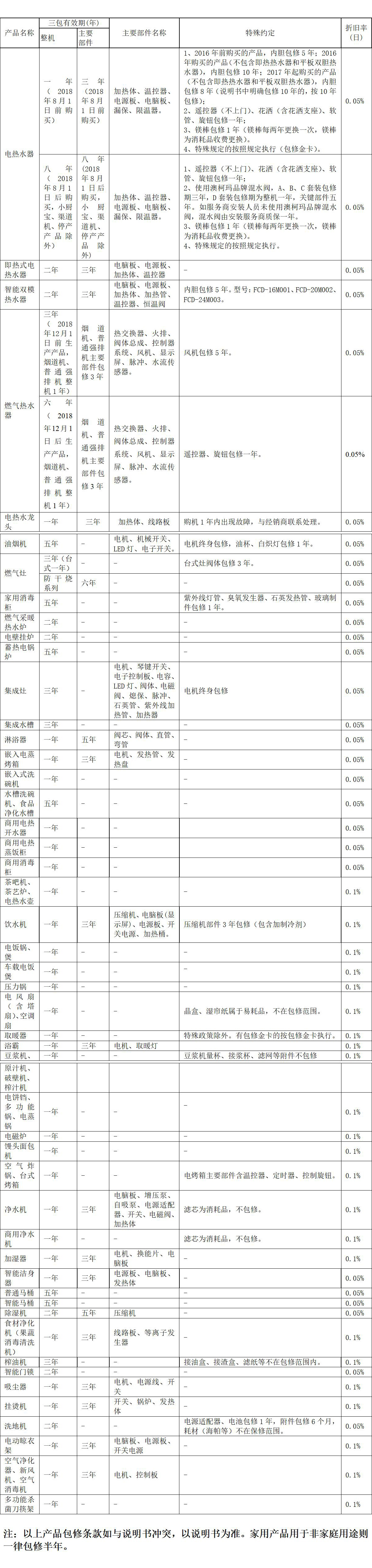 3.5 在三包有效期内,符合换货条件的,(如需调换其它型号,差价则按照甲方当月价格为准计算),销售者因无同型号或同价格产品,消费者不愿调换其它型号产品而要求退货的,由销售者予以免费退货。有同型号同规格产品,消费者不愿调换而要求退货的,由销售者予以退货,对已使用过的商品在退货前应由销售者按本规定代收折旧费,折旧率(日)见上表。折旧费按商品价值和使用时日计算。例如:售价2000元的冰柜,退货时折旧费为2000×0.05%,即每日1元。